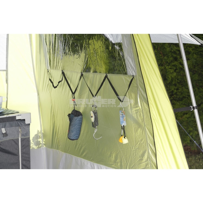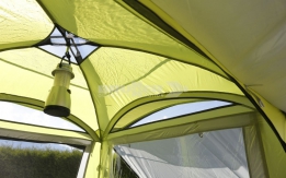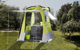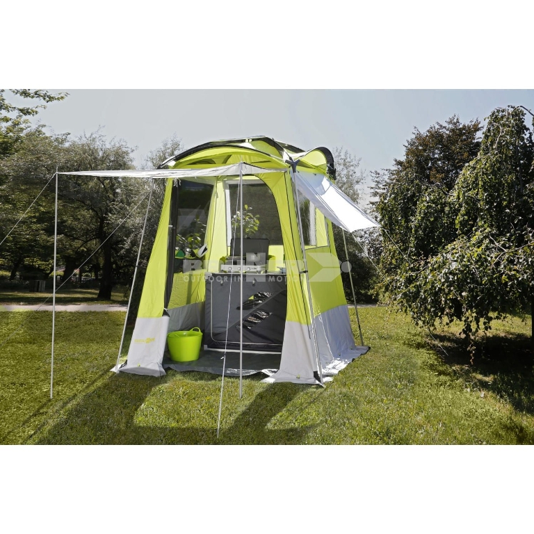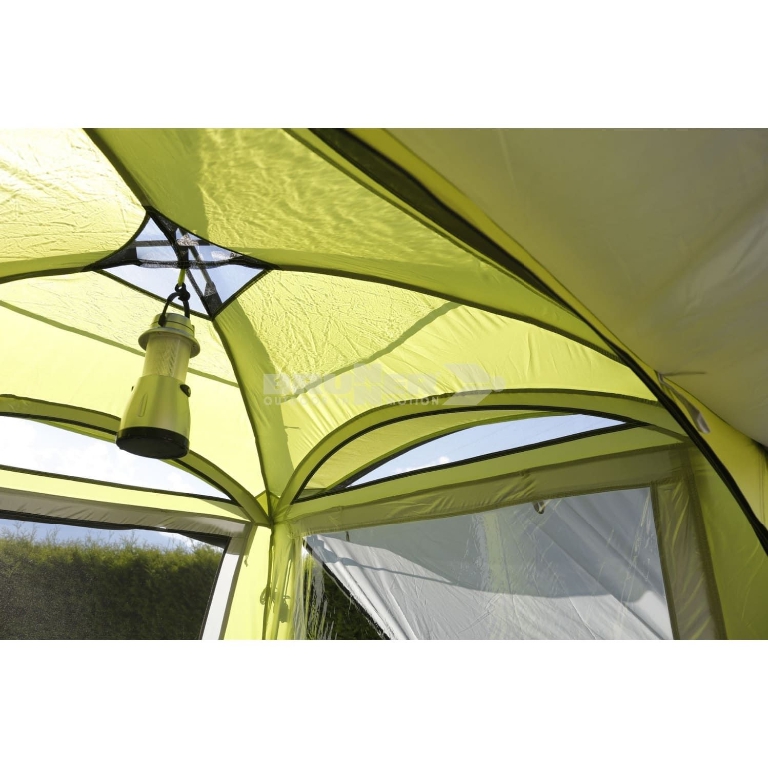 Tre finestre a zanzariera oscurabili, entrata apribile a veranda, aerazione in sommità di cupola e balza in poliestere rivestito in PVC. Completa di sacca custodia e accessori di montaggio.