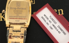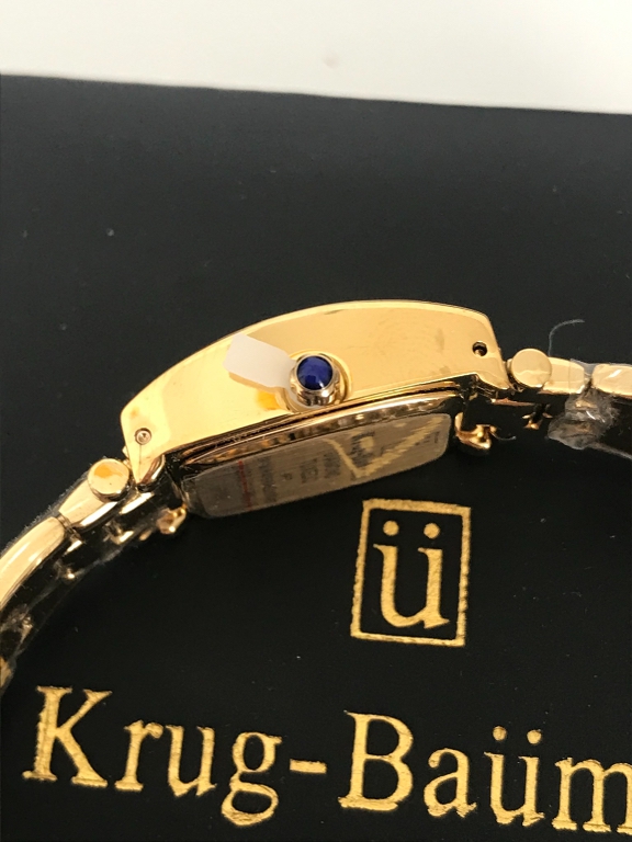 Krug baumen tuxedo diamond, riferimento numero 1965DLG-4D. In acciaio colore oro con movimento al quarzo. Diametro 22x24mm,quadrante nero con 4 diamanti certificati. Datario,vetro zaffiro e water resistant 3ATM. Cinturino lunghezza 20cm regolabile a maglie. Nuovo con piccoli segni del tempo sul perimetro del quadrante come si intravede dalla foto completo di scatola e documenti.